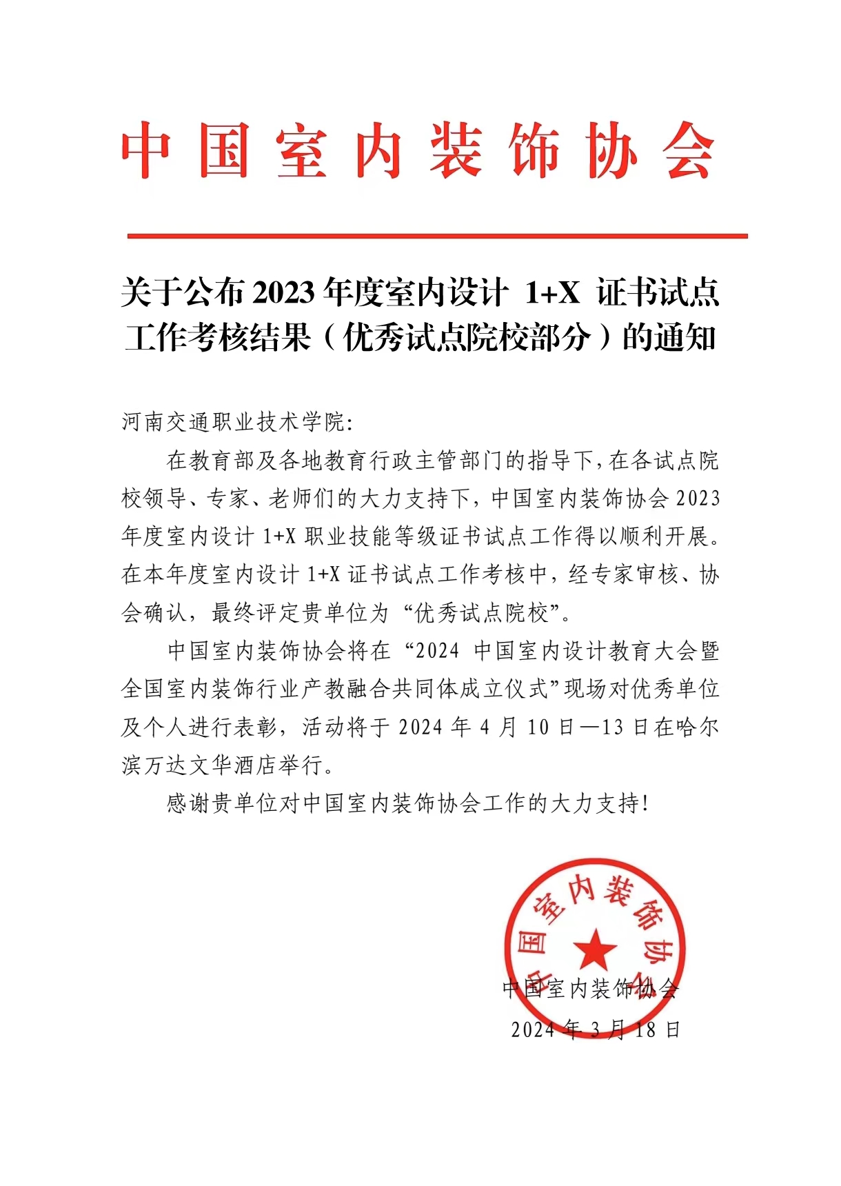 近日1+X室内设计职业技能等级证书评价组织——中国室内装饰协会公布了2023年度优秀单位及个人考核结果的通知。校在年度室内设计1+X证书试点工作中组织得力成绩突出,被评为“优秀试点院校”。