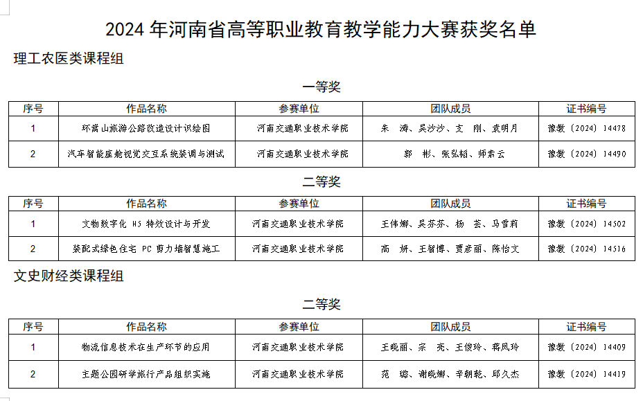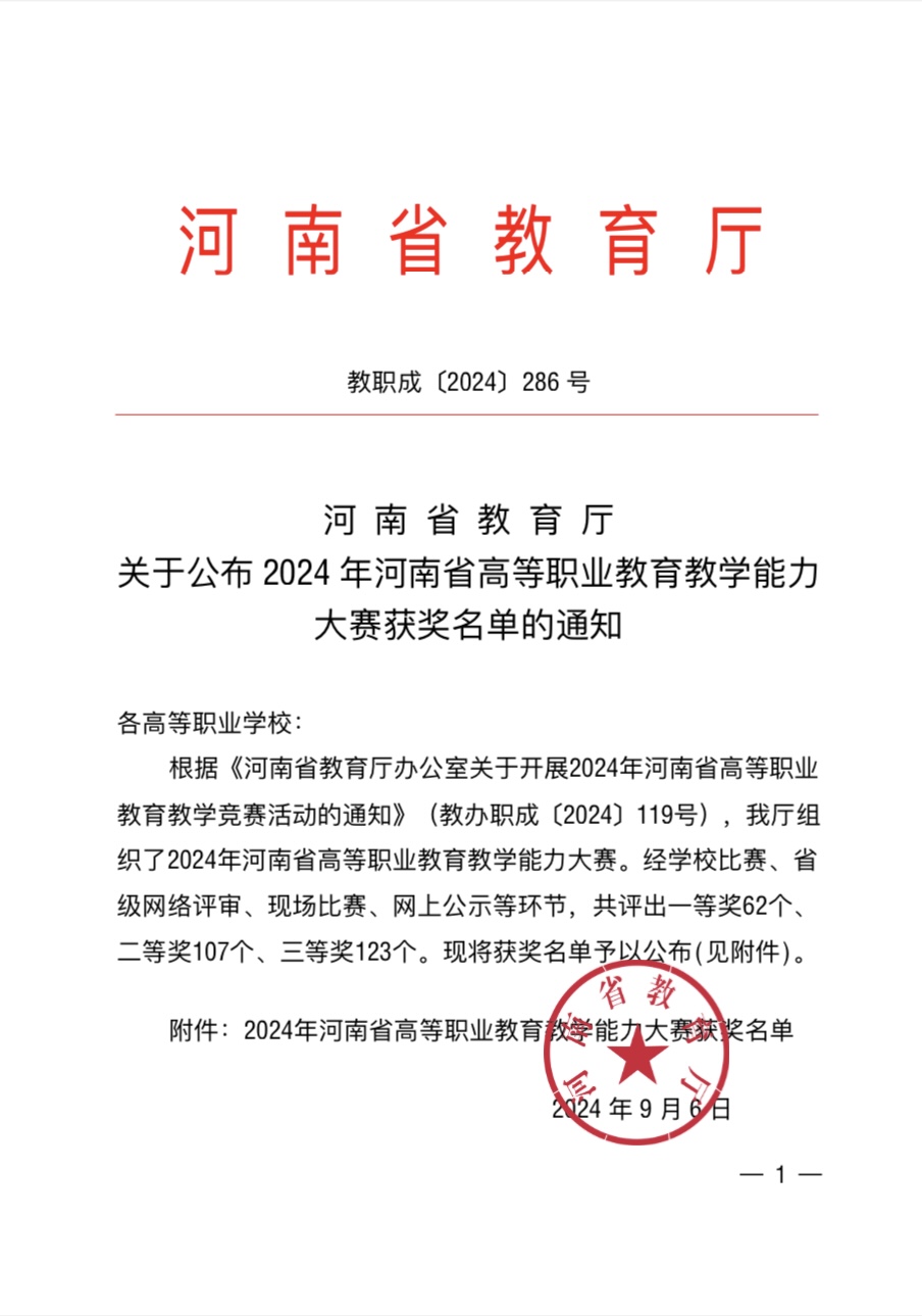 近日,河南省教育厅印发《河南省教育厅关于公布 2024 年河南省高等职业教育教学能力大赛获奖名单的通知》(教职成〔2024〕286 号),我校教师荣获一等奖2项,二等奖4项。