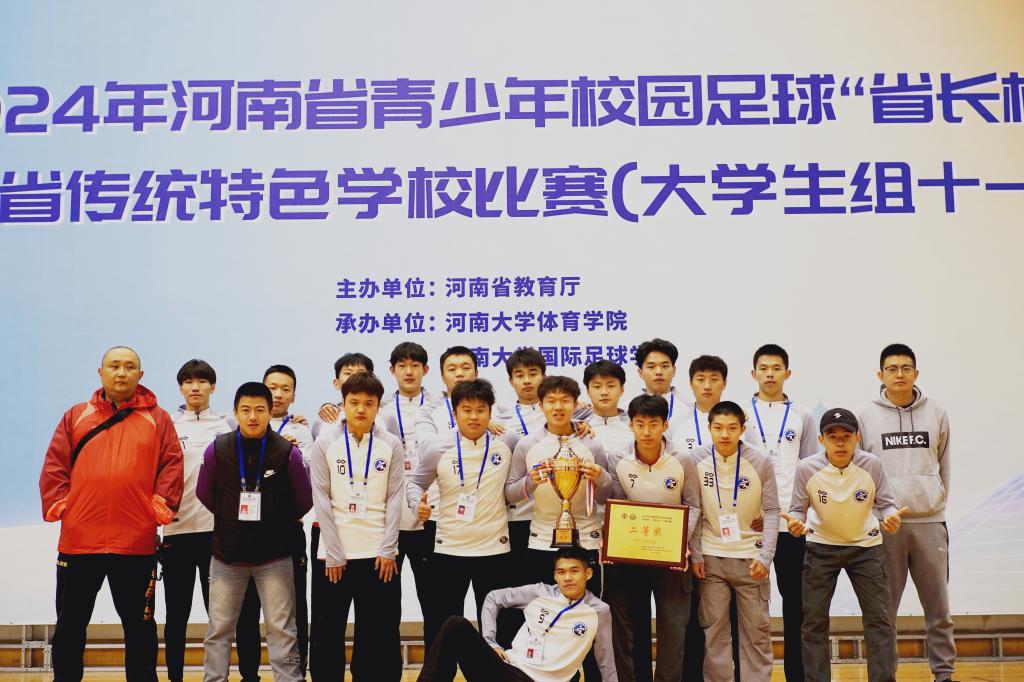 10月20日,由河南省教育厅、河南省体育局主办,河南大学、河南省学生体育总会足球协会承办的2024年河南省青少年校园足球“省长杯”大学组11人制比赛在河南大学明伦校区体育场落下帷幕。经过近一周的激烈角逐,我校男子足球队荣获男子专科甲组季军。