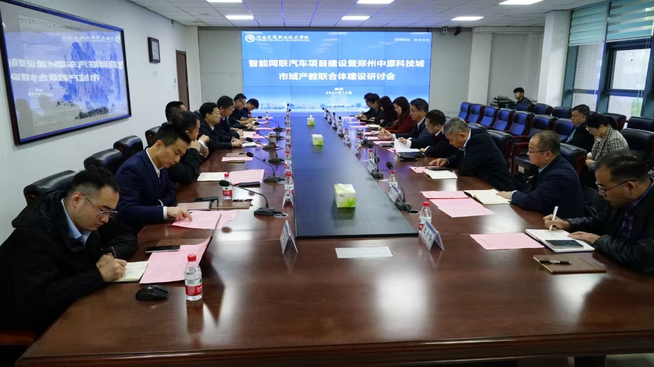 10月27日下午,智能网联汽车项目建设暨郑州中原科技城市域产教联合体建设研讨会在河南交通职业技术学院郑东校区召开。会议由一带一路暨金砖国家技能发展国际联盟交通运输工作委员会常务副主任李怡民主持,国家智能网联汽车创新中心副主任袁宇,郑东新区管委会三级调研员、中原科技城副主任张亚峰,郑州宇通集团教育公司总经理韩德利,郑州中原科技城管委会科技与金融创新局(大数据管理局)副局长王锡成,河南中原智行科技有限公司总经理张小军,郑州捷安高科股份有限公司总经理高志生,河南交通职业技术学院校长焦宏涛、副校长李小强,教务处、科研外事处、汽车学院、交通信息工程系负责人及相关企业代表出席研讨会。