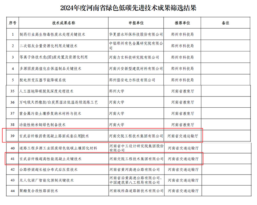 近日,河南省科学技术厅发布《关于2024年度河南省绿色低碳先进技术成果筛选结果的公示》,交院技术集团研发的“玄武岩纤维沥青混凝土路面成套应用技术”“玄武岩纤维超高性能混凝土关键技术”两项技术成果入选,并被编入《河南省绿色低碳先进技术成果目录(2024年)》,向全省推广应用。