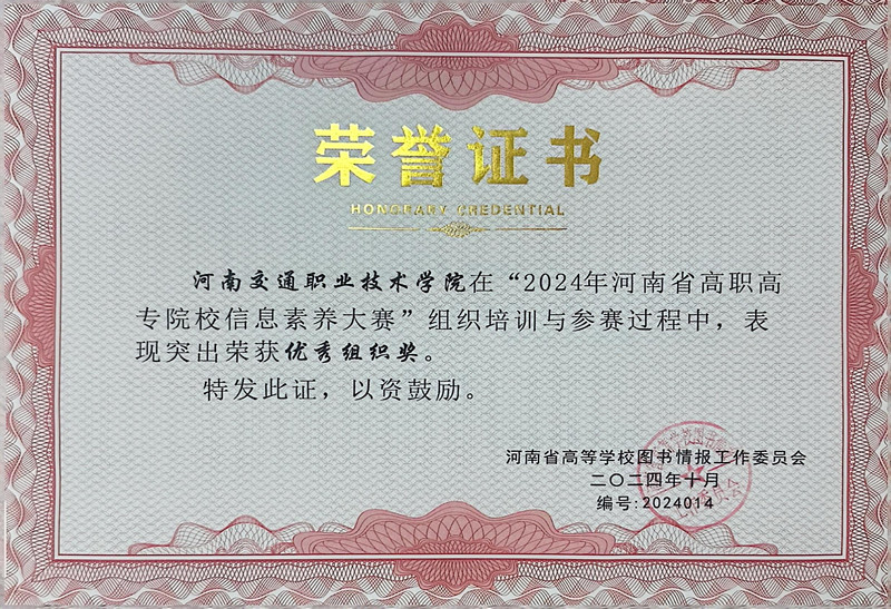 近日,由河南省教育厅和图书情报工作委员会主办的河南省2024信息素养大赛圆满落幕。我校交通信息工程系计算机网络技术专业的吴猛威同学,在激烈的竞赛中表现出色,荣获全省三等奖,并成功晋级全国赛。学校荣获“优秀组织奖”。