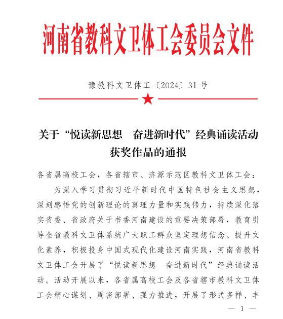 近日,河南省教科文卫体工会主办的“悦读新思想 奋进新时代”经典诵读活动圆满落幕,我校选送的作品在此次活动中分别荣获三等奖1个、优秀奖2个。