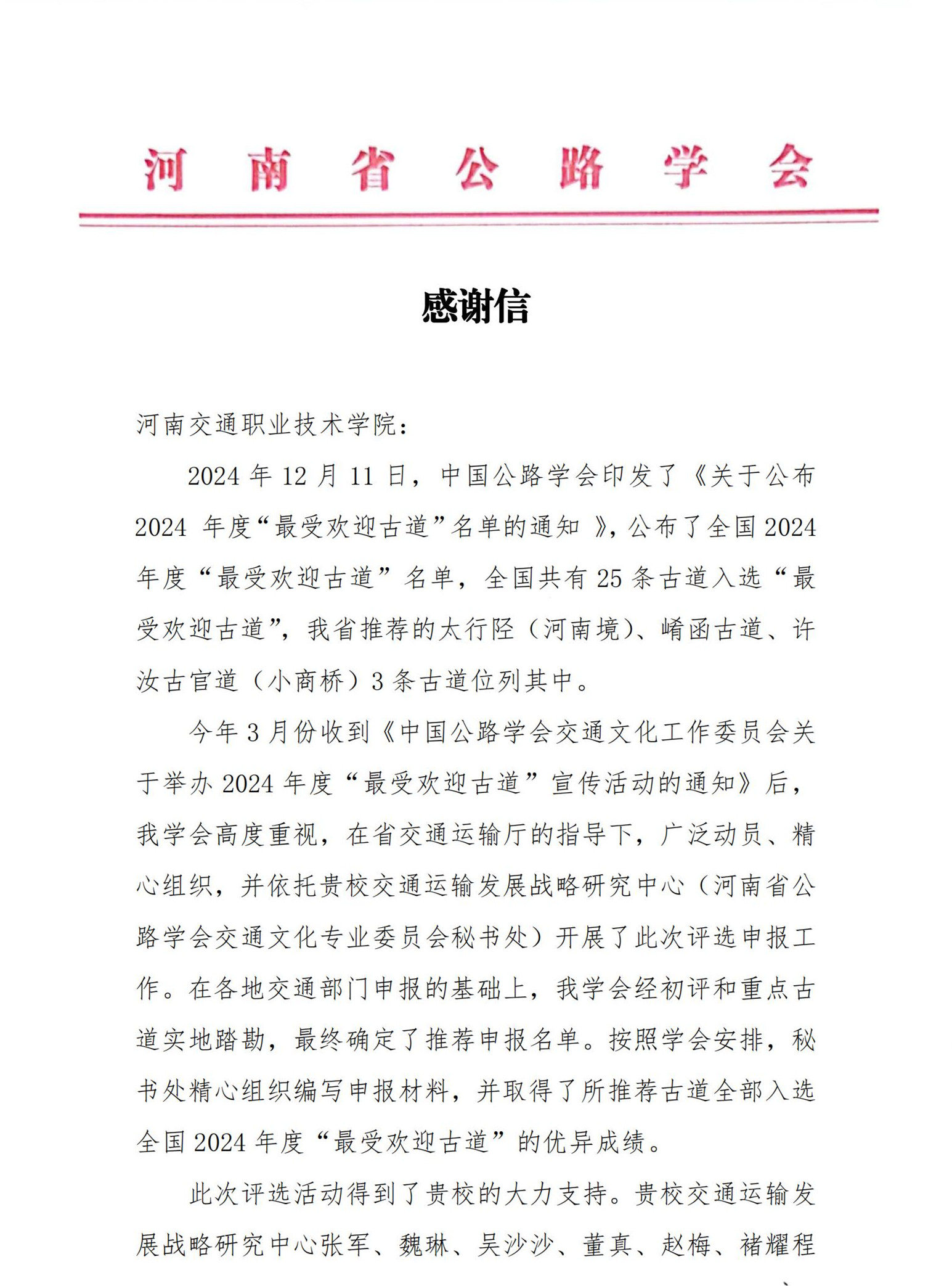 近日,河南省公路学会向我校发来感谢信,感谢我校在全国2024年度“最受欢迎古道”评选活动中所做出的积极贡献。在此次评选活动,我省推荐的太行陉(河南境)、崤函古道、许汝古官道(小商桥)3条古道全部入选,全国共25条入选。