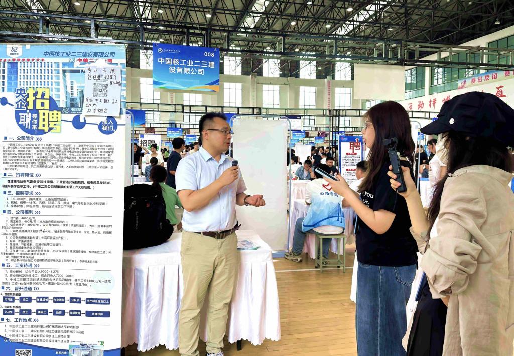双选会现场人潮涌动,求职同学手持精心准备的简历,满怀期待,驻足心仪企业展位前,与用人单位代表交流互动;用人单位则通过海报展示、面对面交流及现场面试等多种形式,向学生介绍企业优势和岗位信息,热情解答同学们的疑问。