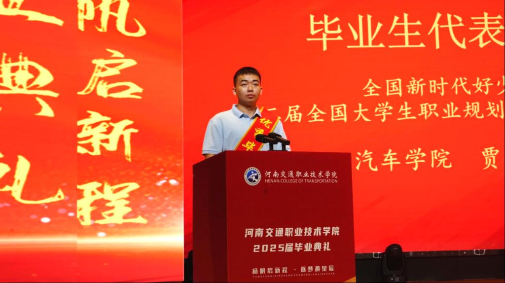 汽车学院毕业生贾永升代表2025届毕业生,回顾成长历程,感恩母校培育与老师教导,表达带着母校的祝福勇敢奔赴新程、以奋斗逐梦新途的青春誓言。