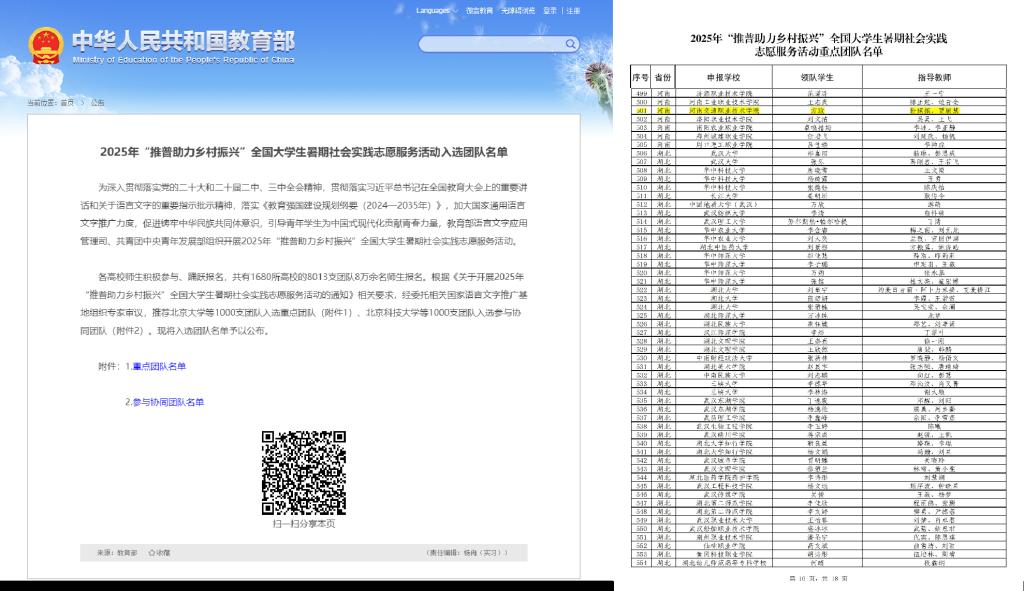 7月3日,教育部公布《2025年“推普助力乡村振兴”全国大学生暑期社会实践志愿服务活动入选团队名单》,学校汽车学院“交息相连”推普助力乡村振兴实践团在众多队伍中脱颖而出,成功入选重点团队。