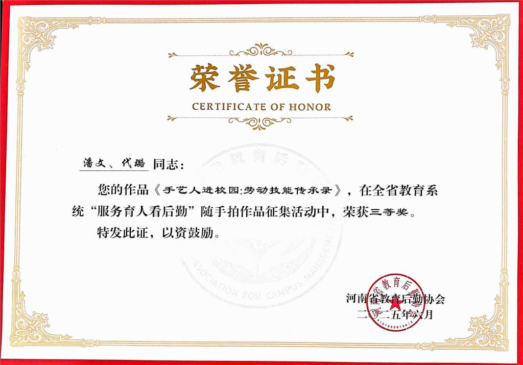 近日,河南省教育后勤协会公布全省教育系统“服务育人看后勤”随手拍活动结果,学校后勤服务集团选送的作品获一等奖1项、三等奖1项。