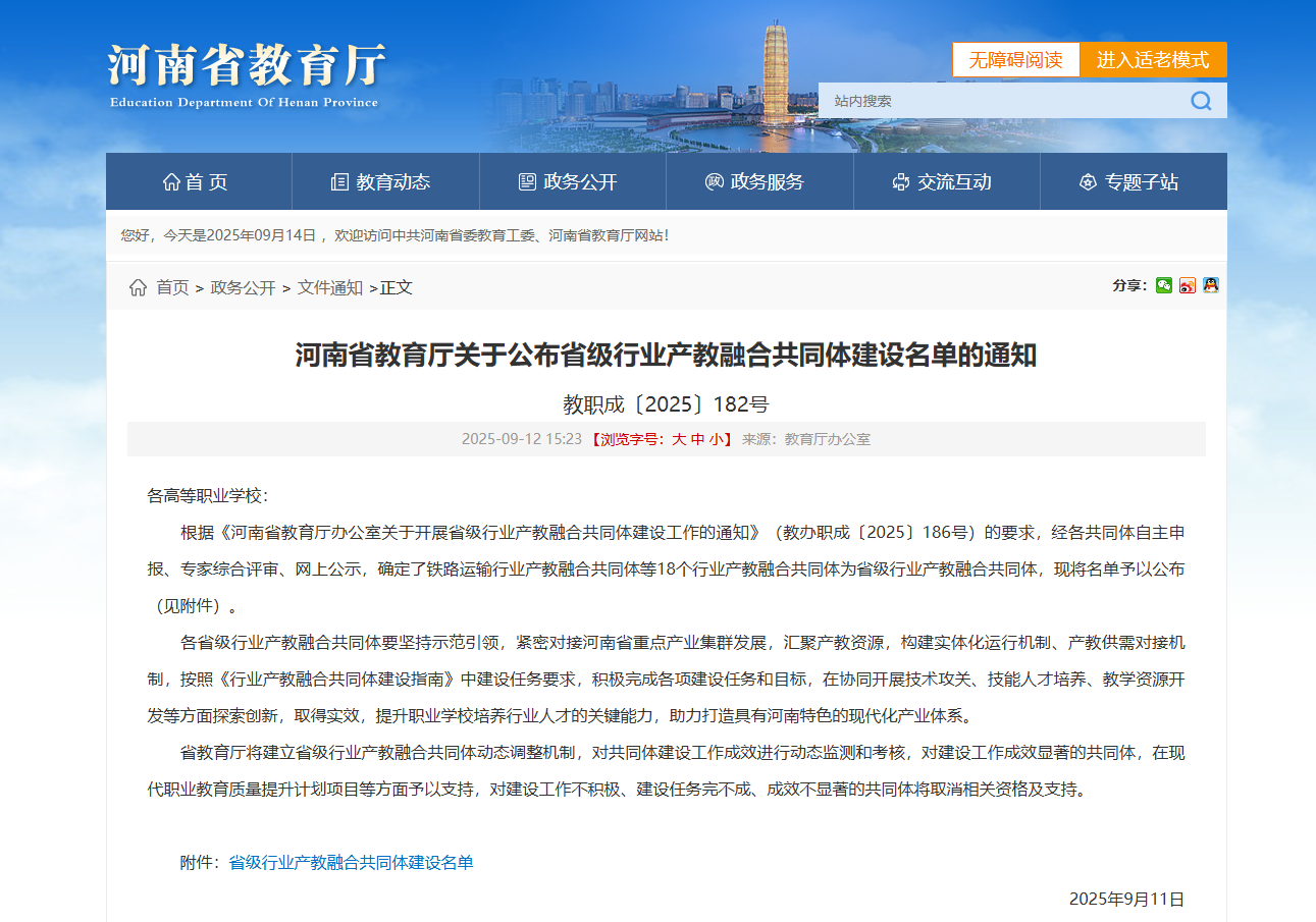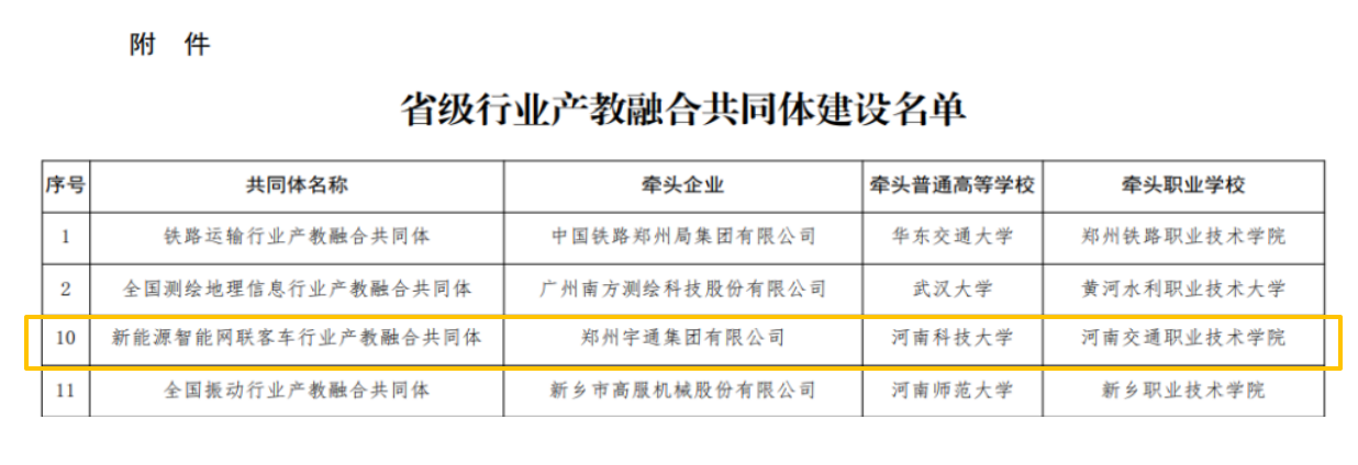近日,河南省教育厅发布《河南省教育厅关于公布省级行业产教融合共同体建设名单的通知》(教职成〔2025〕182号),由学校联合郑州宇通集团有限公司、河南科技大学牵头组建的“新能源智能网联客车行业产教融合共同体”(以下简称“共同体”),成功入选省级行业产教融合共同体建设名单。