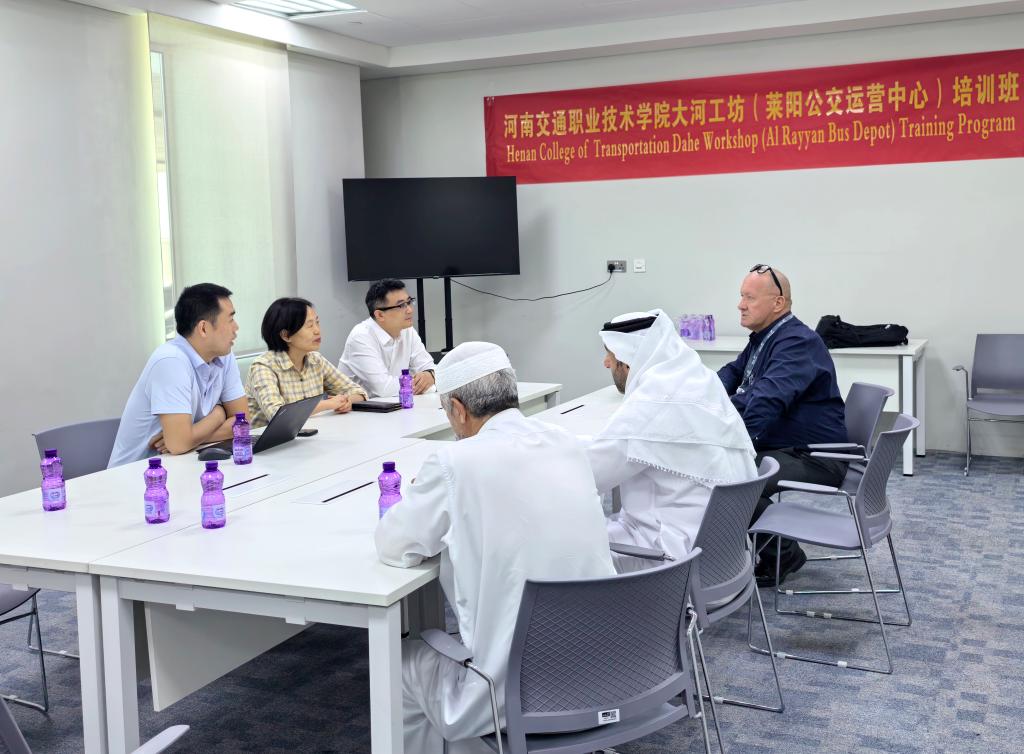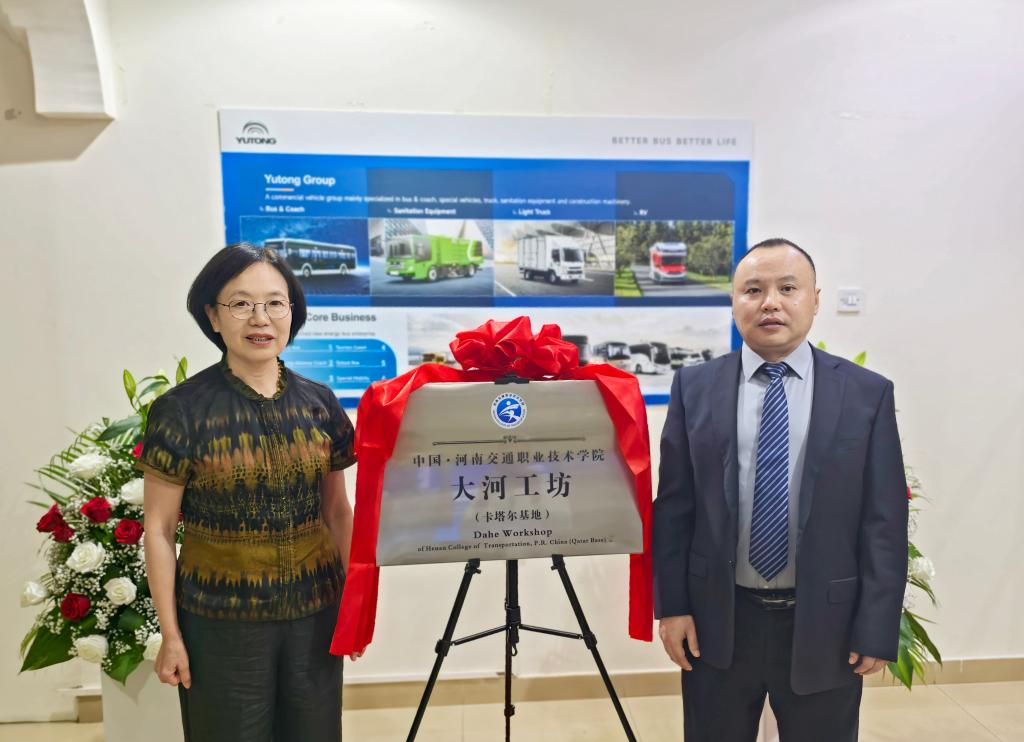 在卡塔尔,代表团访问了卡塔尔国家运输公司、宇通卡塔尔分公司等企业,并与管理层进行了座谈。刘芝梅介绍了学校随企出海的办学优势与大河工坊的建设理念,为即将开工建设的卡塔尔宇通工厂提供定制化的人才培养方案。国内外企业均高度认可学校的人才培养质量,三方共同达成融合发展共识,为“河南交院大河工坊”举行了揭牌仪式。