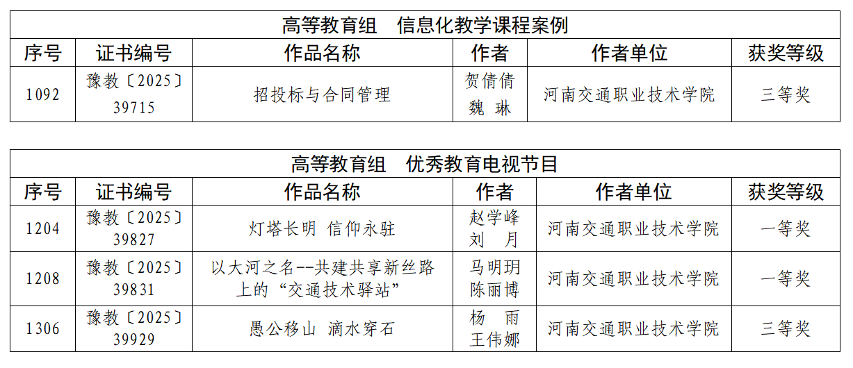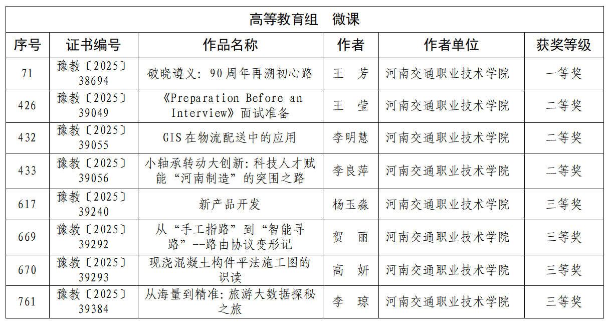 近日,河南省教育厅发布《关于公布河南省第二十九届教育教学信息化交流活动评选结果的通知》,学校荣获高等教育组一等奖3项、二等奖3项、三等奖6项。