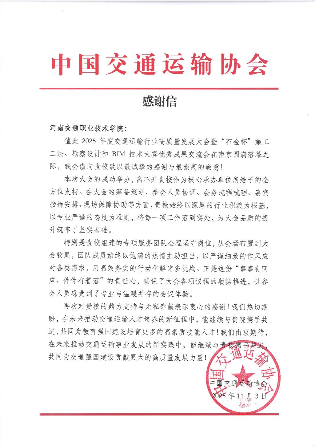 日前,河南交通职业技术学院收到中国交通运输协会的感谢信,对学校作为核心承办单位在“2025年度交通运输行业高质量发展大会暨‘石金杯’施工工法、勘察设计和BIM技术大赛优秀成果交流会”中所作出的突出贡献表示衷心感谢与崇高敬意。