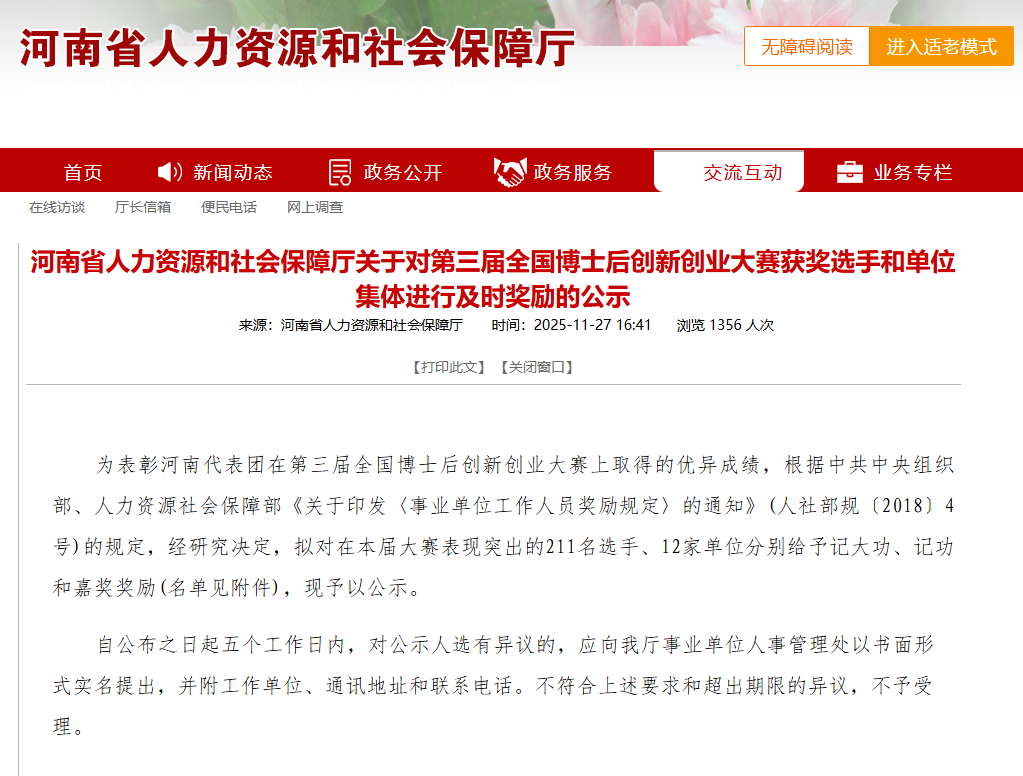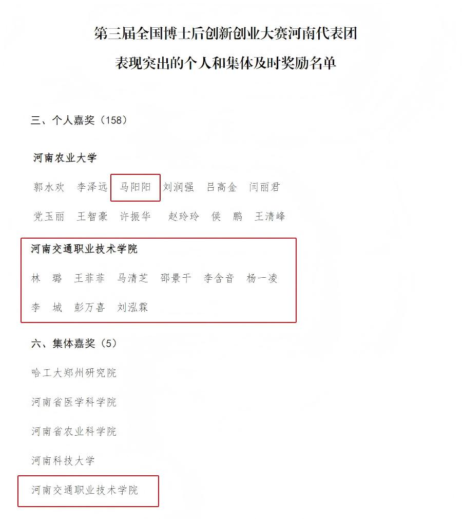 近日,河南省人力资源和社会保障厅发布了《关于对第三届全国博士后创新创业大赛获奖选手和单位集体进行及时奖励的公示》,对在本届大赛中表现突出的选手和单位分别给予记大功、记功和嘉奖奖励。学校荣获“集体嘉奖”,学校交院技术集团博士后科研工作站马阳阳、林璐、李含音、李城、刘泓霖5名博士后研究员以及学校科研外事处处长邵景干、博士后科研工作站办公室负责人王菲菲荣获“个人嘉奖”。这一荣誉,体现了省级主管部门对学校在高层次人才培养和科技创新领域工作的充分肯定。