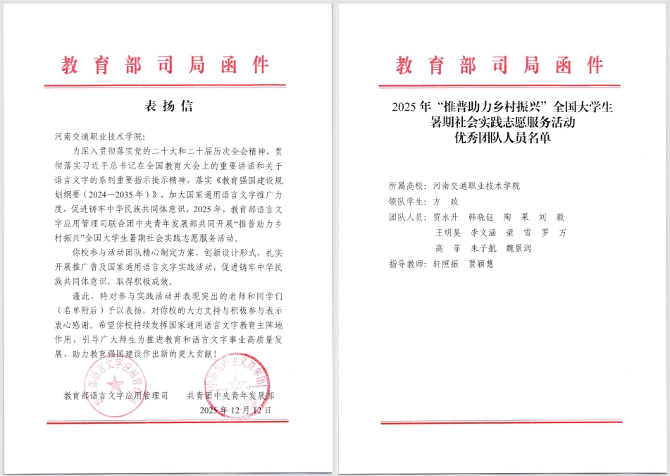 近日,教育部语言文字应用管理司与共青团中央青年发展部联合发来表扬信,对学校在2025年“推普助力乡村振兴”全国大学生暑期社会实践志愿服务活动中的突出表现予以表彰,对参与实践活动的优秀师生团队给予充分肯定,并向学校致以衷心感谢。