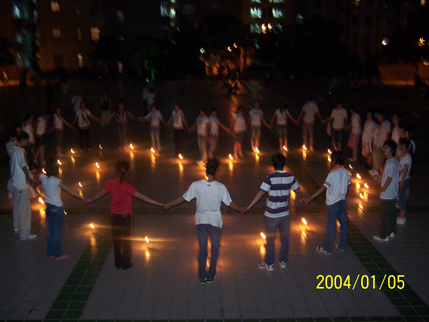 2008年5月21日晚上,经济管理系货代班学生在辅导员老师的带领下在学院文化广场举行烛光祈福活动,深切悼念在汶川大地震中不幸遇难的同胞。