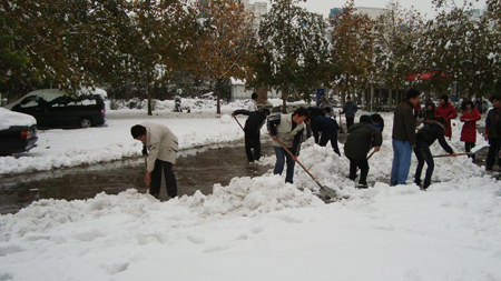 昨晚一场大雪突然降落,由于是今年冬天的第一场雪,校园里到处可以看到欢乐的身影,堆雪人、打雪仗,大家充分的享受着冬日带给我们的寒冷中的温馨,但同时也给师生的出行带来诸多不便。为了使道路畅通,保证师生的安全,今天中午道桥系学生会在团总支的带领下展开了热火朝天的清扫积雪活动,学生们利用扫帚、铁锨等工具将道路上的积雪清理到草坪上,既清扫了道路,又使草坪得到了更好的滋润。经过大家的共同努力,在下午上课之前已将办公楼前和图书馆前的积雪清扫完毕。