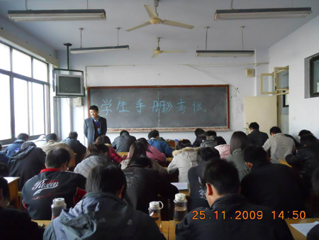 根据学院2009年“关爱生命、预防甲流、做文明学生、创文明校园”文明月系列活动安排,为了引导2009级学生更全面、更深入的掌握学院的各项规章制度,提高遵守校规校纪的自觉性,加强学风建设,我院于11月25日下午举行了2009级新生《学生手册》考试,全院3000多名新生参加此次考试。