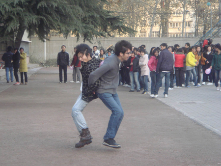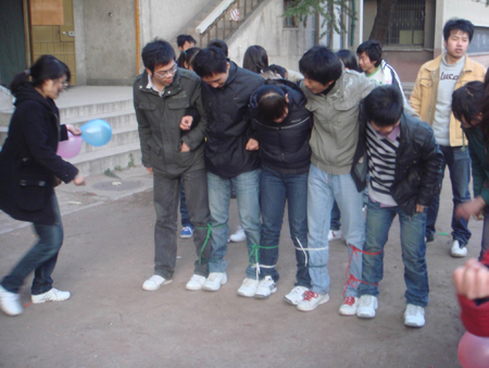 “运气球”、“绑腿跑”这两项运动是要考验同学们的配合意识和团结精神,两个同学齐心协力把一个气球运到目的地,同学们用布条将自己与临近的队友的小腿部绑在一起,从而合为一体,一起跨步前行。每支队伍都在小心翼翼而又奋力前进并接力进行着,虽然有时落后却并不放弃而一直走完全程的精神也让周围同学们报以热烈掌声。
