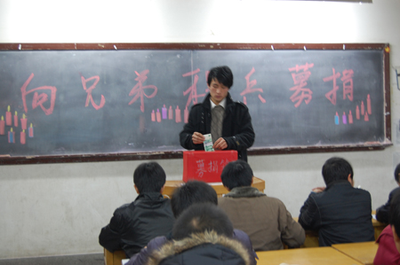 12月13日晚19点,在机械08301、08302教室,一场为程兵同学的爱心募捐正在进行。我们08级机械专业的同学们纷纷献出了自己的一片爱心,积极捐款。在一天之内共筹得1941元。