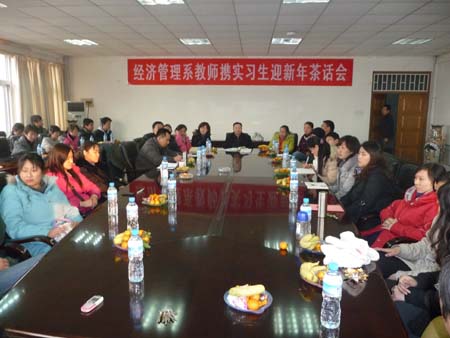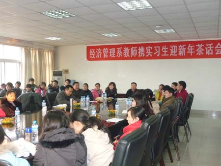 12月23日下午,学院办公楼三楼会议室,欢声笑语,茶香意浓…。经济管理系正在举办师生迎新年茶话会。经济管理系全体教师与18名学生代表聚集一堂,共话师生情校园事。本次迎新年茶话会是由系党总支牵头,系工会小组组织,特别邀请了07级实习生代表和在校生代表参加,学生代表都是预备期满的预备党员,将预备党员转正、工会活动、师生迎新年三项主题有机融为一体。