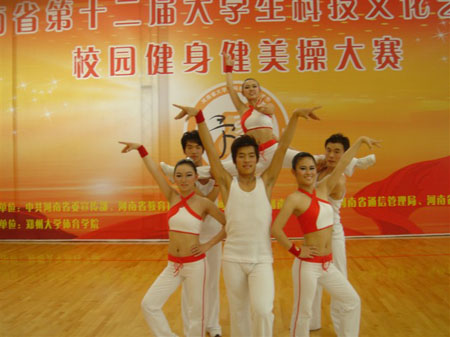 河南省第十二届大学生科技文化艺术节校园健身健美操大赛于5月22日在郑州大学体育学院举办,我院健美操队在王心心老师的带领下参加了本次比赛。