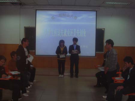 在首轮辩论中,旅游10302和建工10302两个班就“大学生应该先就业还是先创业”这个辩题展开了激烈的交锋。双方辩手在充分准备的基础上,论理准确到位,旁征博引,以具体事例和名言警句形象地阐述了自己观点的合理性。在最精彩的自由辩论环节中,双方更是展开了一场唇枪舌战,在对抗中碰撞出思想的火花,精彩的辩论博得了在场听众阵阵热烈的掌声。最后,正方建工10302班获得此轮比赛胜利。