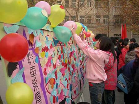 活动在舒缓的音乐声中开始。活动现场人来人往,同学们纷纷在一张张心形的纸片上虔诚的写下自己的祝福,感恩父母,感恩老师,感恩朋友,感恩所有认识的和不认识的人。不到二十分钟,“心愿感恩墙”上已经贴满了大家的祝福。