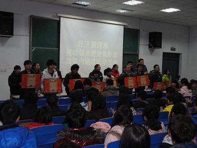 会上,首先对在2010-2011学年第一学期星级宿舍创建过程表现优秀的班集体进行了表彰,其中获得优秀班集体的会计10301班、连锁10301-10302班、市场营销10302班、物业10301班五个班所有的宿舍全部被评为五星级宿舍。经济管理系的192间学生宿舍共有188间上星,上星率高达98%,其中四星、五星级宿舍比例达到87%,领跑全院,充分发挥了示范带动作用。随后,获得优秀班集体、星级宿舍的学生代表在大会上进行了交流发言。