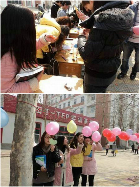本次活动历时4天,以“三八”妇女节为契机组织开展了“心语纷飞”、“用气球说话”、“礼仪访谈,沟通你我她”讲座、“传递我祝福”等活动,体现了学院的人文关怀,提高了女生的素质修养,在全院女生中引起强烈反响。