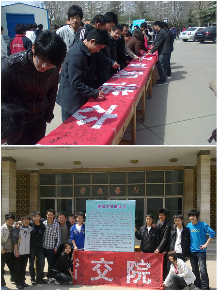 为为贯彻落实《中共中央 国务院关于进一步加强和改进大学生思想政治教育的意见》,切实加强我院学生精神文明建设,促进我院学生良好学风、校风的养成,结合学院“大学生关爱月”活动,学生工作处于3月24日、3月29中午11点50分别在我院南、北校区开展“做文明学子、创和谐交院”倡议、签名活动。 本次活动旨在:强化学院内涵建设,活跃校园文化氛围,引导学生主动了解“和谐校园”的理念,积极参与和谐校园的构建,促进学生健康全面发展。号召学生,从自身做起,积极行动,以高度主人翁责任感,为了杜绝校园内的不文明行为,营造优美、和谐、秩序井然地学习、生活和工作环境,贡献自己的力量。 本次倡议、签名活动,组织得力、宣传充分、学生参与积极,共有1300多名学生参与此次倡议、签名活动。同学们纷纷表示要从自身做起,从小事做起,为构建和谐校园贡献自己的力量,充分体现出了我院学生良好的精神面貌和道德素养。 (供稿:学生工作处 图/文 张治国) |