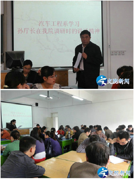 会议首先传达了孙廷喜厅长一行在学院调研时的重要讲话,大家一致认为讲话体现了厅党组领导对教育的高度重视,对学院建设和发展的大力支持。孙厅长关于“对教育的支持是最有远见的举措,对教育的支持就是对发展、对未来、对社会的支持,支持教育支持到哪都不为过”的论述,更是让大家记忆深刻。会上,系主任宋保林还与大家分享了学习孙厅长讲话精神的心得,以及厅领导在我院考察汽车系实训中心时的体会和感受。参会教师也分别就学习孙厅长讲话精神,各自畅谈了自己的学习心得。