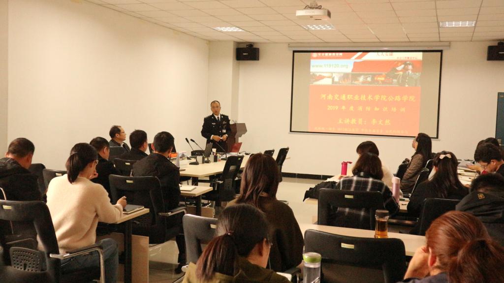 10月23日下午,公路学院邀请人人安康社会工作服务中心消防工作处教员李文然在新校区开展消防安全知识专题讲座;公路学院全体教师积极聆听,讲座由公路学院党总支书记徐前进主持。
