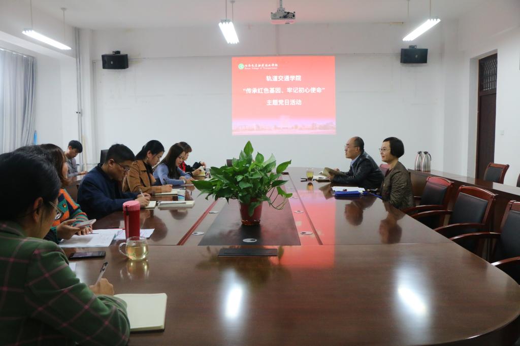 10月23日下午,轨道交通学院党总支开展“传承红色基因,牢记初心使命”主题党日活动。轨道交通学院全体教工党员参加会议,会议由轨道交通学院党总支书记熊瑛主持。