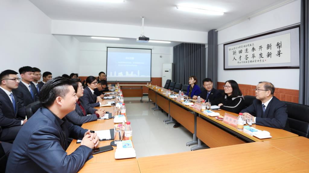 下午三点,陈振锋一行在苏孝岑的陪同下参观了洞林湖、案场项目及新田城住宅项目,苏孝岑介绍了新田物业的发展现状、未来规划和住宅小区物业管理的实际应用,并展示了先进的企业文化、设施设备、管理系统和对业主全方位关怀的服务理念。随后,校企双方进行调研座谈会。会上,苏孝岑就新田集团的发展历史,新田物业的服务理念以及人才培养方案进行了介绍,他指出“人才,是新田物业最根本的源动力和驱动力”,并高度赞扬了学院为企业发展做出的贡献,希望河南交院一如既往地为企业输送优秀人才。