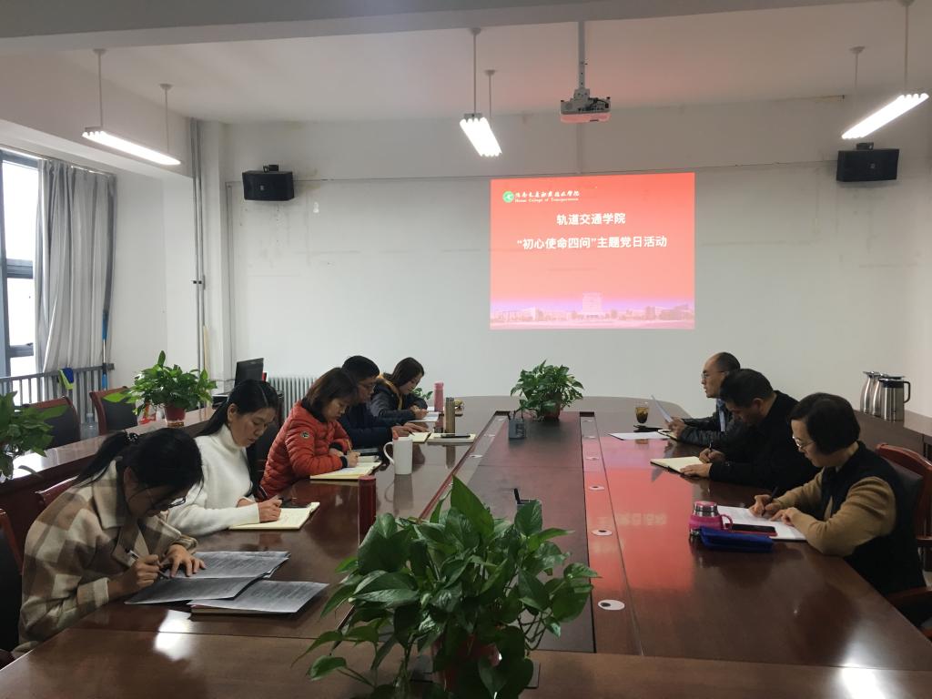 11月20日,轨道交通学院党总支组织召开“初心使命四问”主题党日活动,党总支全体党员参加会议,会议由轨道交通学院党总支书记熊瑛主持。