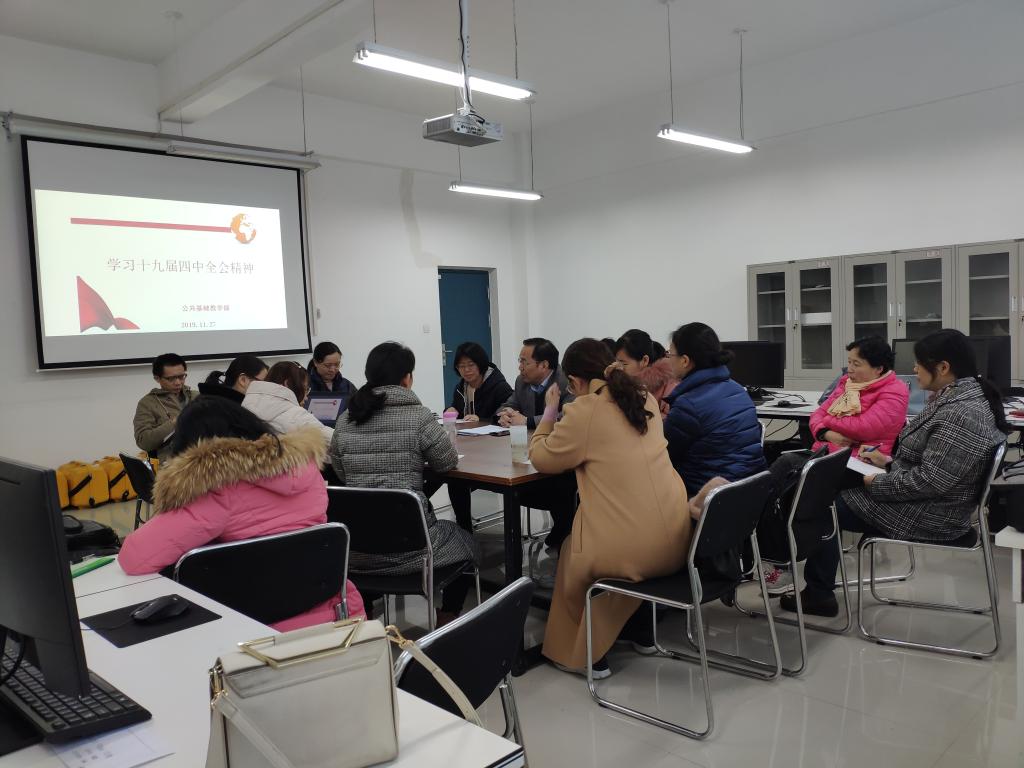 11月27日,公共基础教学部在新校区召开学习贯彻党的十九届四中全会精神专题会议。基础部全体党员教师参加会议。会议由基础教学党总支书记孙红伟主持。