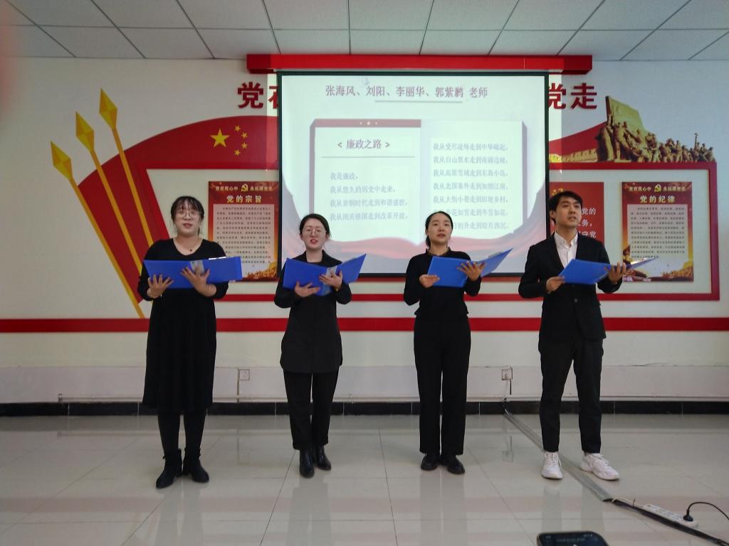 此次活动共分三个环节。在廉政誓词宣誓环节,副校长夏连学带领全体教师举起右手宣读誓词,誓言铿锵有力,大家精神抖擞,共表倡廉决心。在廉政知识竞答环节,现场采取主持人出题,微信答题的方式进行,全体人员争先恐后、积极参与。在诵读环节中,孙莉萍、张凯、孙烈晖、兰尧、曹卉、董征等教师朗诵了《红心向党 廉洁从教》《中纪委在拨乱反正中的重建与恢复》《激浊扬清 廉洁兴政》《廉洁育人 筑梦中国》《廉政之路》《百年颂歌》和《一根黄瓜》等优秀作品。最后,现场播放了姜海莹老师制作的微视频《红歌一曲唱心声、革命精神永流传》,参与人员声音嘹亮,精神饱满,为大家呈现了一场视听盛宴。