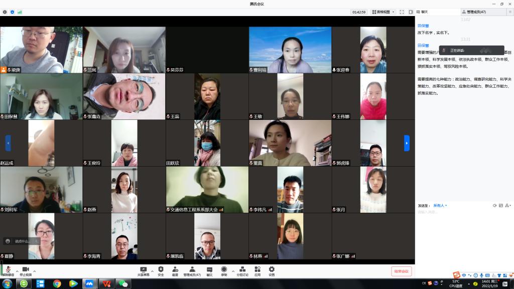 为贯彻落实《河南交通职业技术学院“能力作风建设年”活动实施方案》的要求,1月19日,交通信息工程系依托腾讯会议平台,通过线上方式召开了“能力作风建设年”活动动员部署会。会议由系党总支书记张迎春主持,全体教工参加会议。