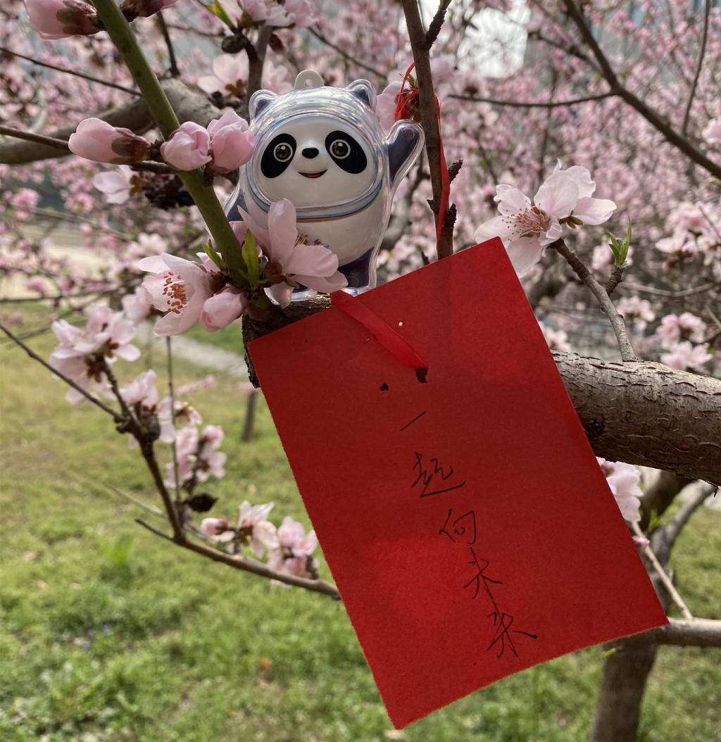 在春暖花开之时,3月22日,由校团委组织的“春日寄语”主题活动在图书馆和明德楼旁边开展。同学们领取红色卡片,将自己的祝福和愿望写在上面并挂于花树枝头。卡片随着清风起舞,引得师生纷纷驻足围观。