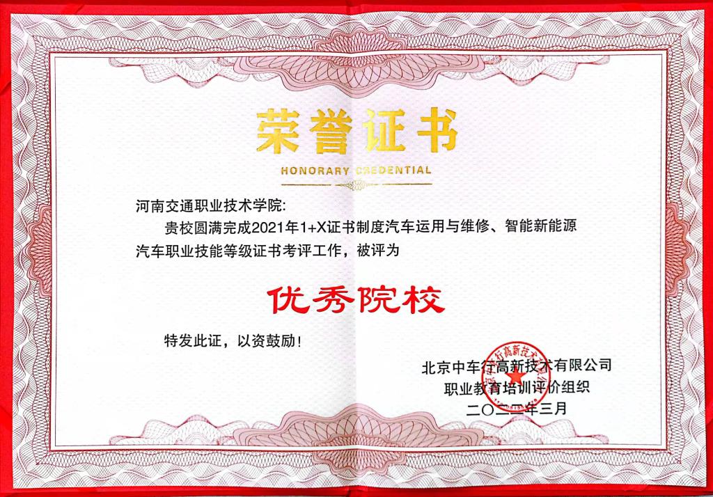 近日,我校收到1+X证书制度试点职业教育培训评价组织-北京中车行高新技术有限公司来信,我校被评为2021年度1+X证书制度职业技能等级证书考评工作“优秀单位”,朱学军、张杰飞、冯顺利等三位教师被评为“优秀专家”。