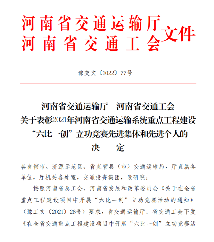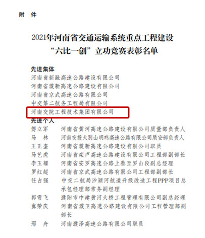近日,河南省交通运输厅、河南省交通工会联合印发《关于表彰2021年河南省交通运输系统重点工程建设“六比一创”立功竞赛先进集体和先进个人的决定》,对全省重点工程建设中涌现出来的先进集体和先进个人予以表彰,我校校属企业河南交院工程技术集团有限公司获评“先进集体”荣誉称号。
