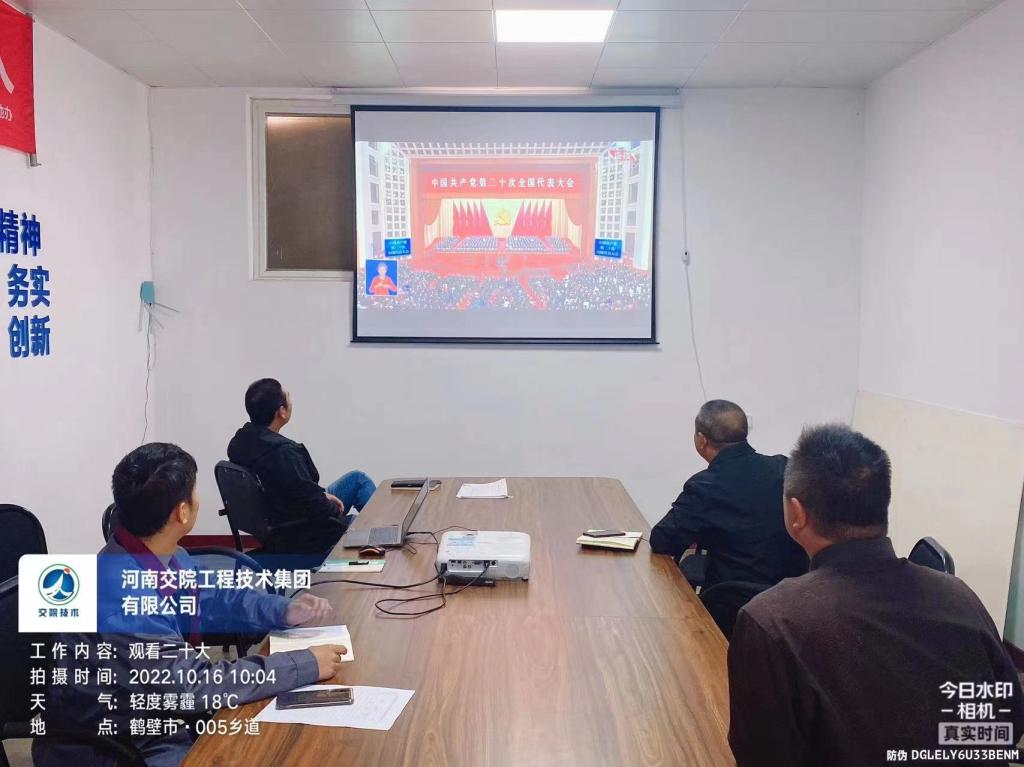 中国共产党第二十次全国代表大会16日上午在北京人民大会堂开幕。习近平总书记代表第十九届中央委员会向大会作报告。交院技术集团党总支积极响应河南省交通运输厅党组及河南交通职业技术学院党委精神号召,组织集团本部工作人员在第一会议室集中观看现场直播,各项目、分公司自行组织观看。
