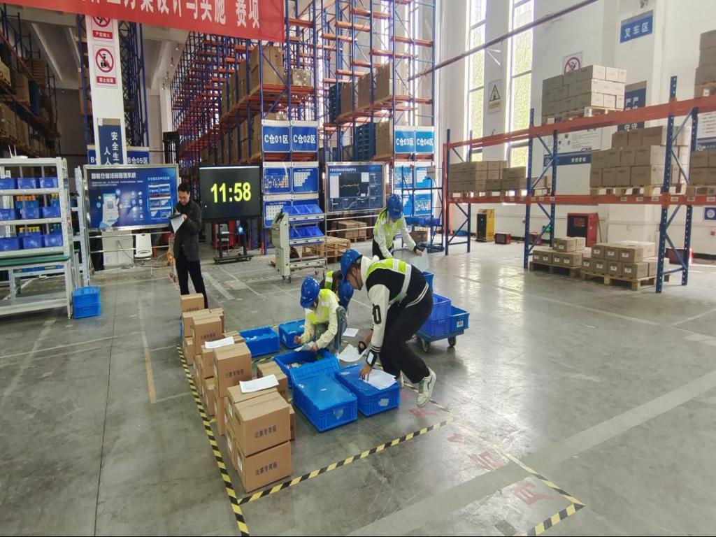 两队选手按照竞赛要求,在规定的时间内,进行了“物流作业方案设计模块、物流管理1+X职业能力测评模块、物流作业方案实施模块、仓库布局设计与设备仿真搭建模块”4个模块中的物流作业方案实施模块环节比拼。选手依据物流作业方案的设计结果,根据作业任务需求,使用托盘、地牛等物流设备和工具,通过信息化设备与软件,执行入库作业计划、出库作业计划等操作。选手在实施过程中充分展示了在作业过程所需要的组织管理、专业团队协作、现场问题分析与处理能力。