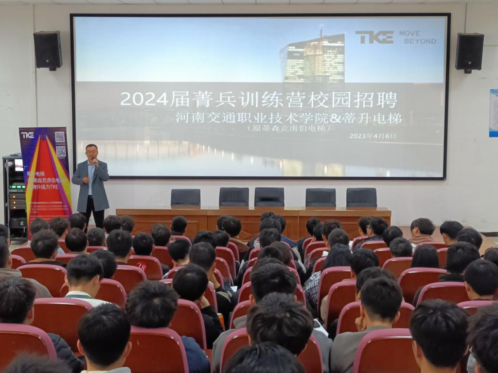 宣讲会上,蒂升电梯郑州分公司韩义光经理对公司概况、发展理念、人才发展空间等方面进行简要介绍。他表示,菁兵训练营是重点培养电梯维修技能型人才的锻炼平台,公司将继续与轨道交通学院做好校企共同育人工作,服务地方产业发展。他还介绍了校企合作开展情况、人才供需项目等具体实施方案,表达了愿与学校一起做好学生实习就业工作的信心。