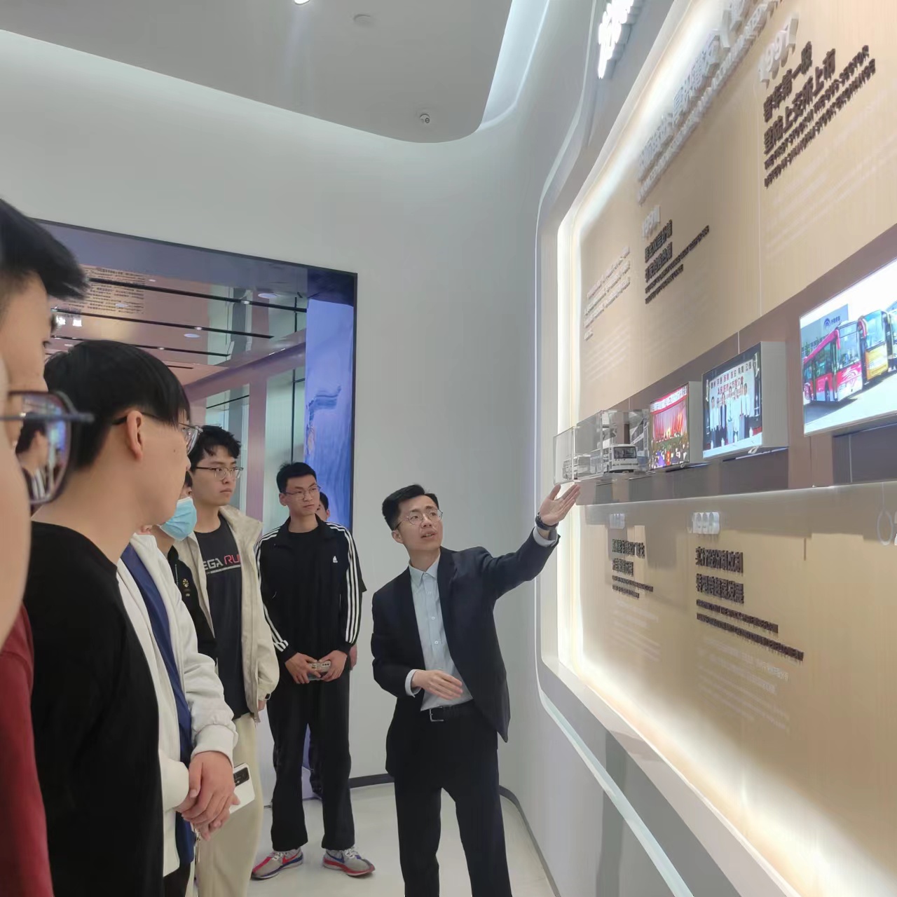 在企业人员的陪同下,同学们依次参观了承装车间、试车道及宇通客车博物馆。在参观中,企业人员从宇通的发展历史、发展理念、发展目标、主营业务范围、相关业务流程等方面为大家展开了详细的介绍。