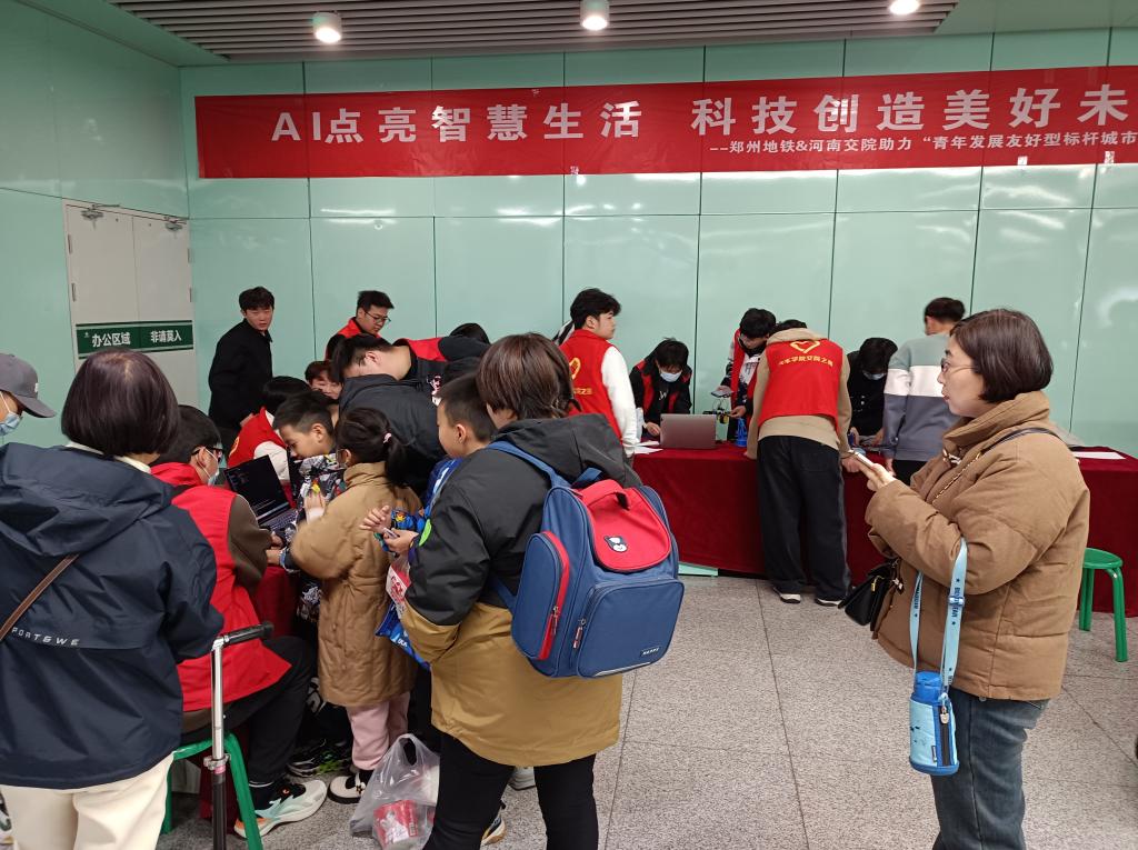 为了加强文化地铁建设与宣传,助力郑州“青年发展友好型标杆城市”建设。汽车学院智能网联技术协会应郑州地铁的邀请,联合郑州地铁五号线冯庄中心站,于11月12日在郑州市第二人民医院站厅举办了题为“AI点亮智慧生活,科技创造美好未来”的科普活动。本次活动得到校团委、汽车学院学生党支部和航海路校区创业协会等部门的大力支持。