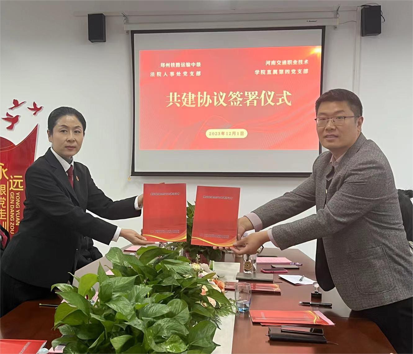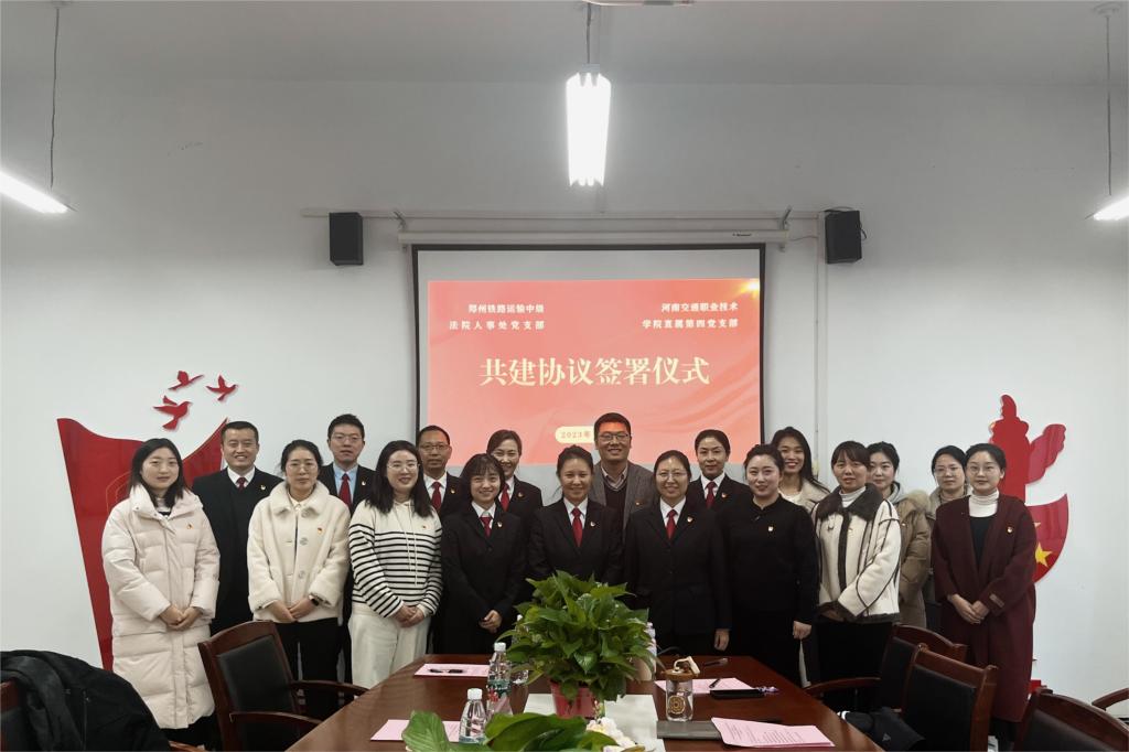 仪式上,刘喜要对郑州铁路运输中级法院一行的到来表示热烈欢迎。随后,双方党支部分别介绍了各自支部党建和业务开展情况,并围绕党支部建设、院校共建、模拟法庭和普法强基等多方面内容进行分享交流。双方一致表示,今后要积极开展党支部共建活动,加强信息共享、资源共通,凝聚共建合作的党建合力。最后,双方共同签订了《基层党组织结对共建协议书》。