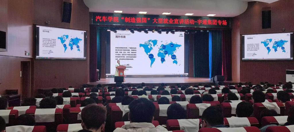 宣讲会上,李丽向同学们详细介绍了宇通集团的发展历程、企业文化、企业产品、人才需求、招聘职位及薪酬福利等方面的相关政策,并现场为同学们答疑解惑,让学生对企业有了更深层次的了解。目前在宇通集团实习的汽车学院21级实习生冯祥、刘振宇现场向同学们分享了在宇通集团实习的实际情况和感受。在宇通集团海外岗位工作的20级毕业生李志、盛衡宇,通过视频连线分享了工作经验并和现场同学们交流互动,希望同学们对宇通集团有更充分的了解。在招聘宣讲会现场,学生们积极踊跃参与,提问互动环节会场气氛高涨。