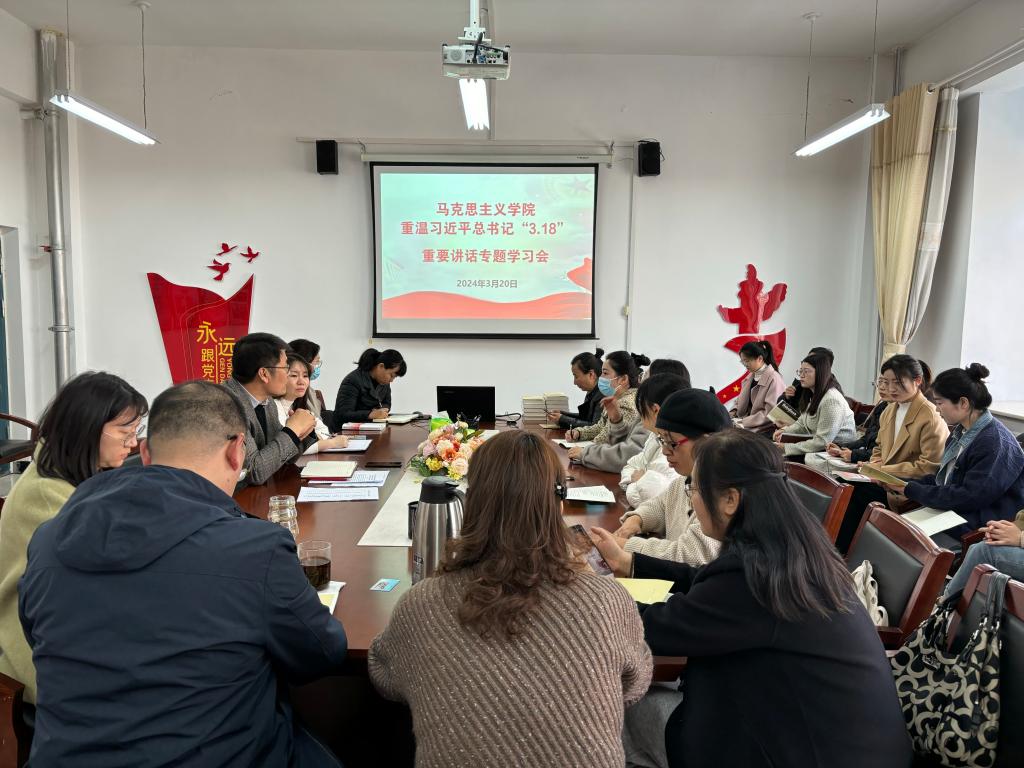 为持续深化落实习近平总书记“3.18”重要讲话精神,扎实推进思政课改革创新,3月20日下午,马克思主义学院在院会议室召开重温习近平总书记“3.18”重要讲话精神专题学习会,会议由马克思主义学院院长刘喜要主持,马克思主义学院全体教师参加会议。