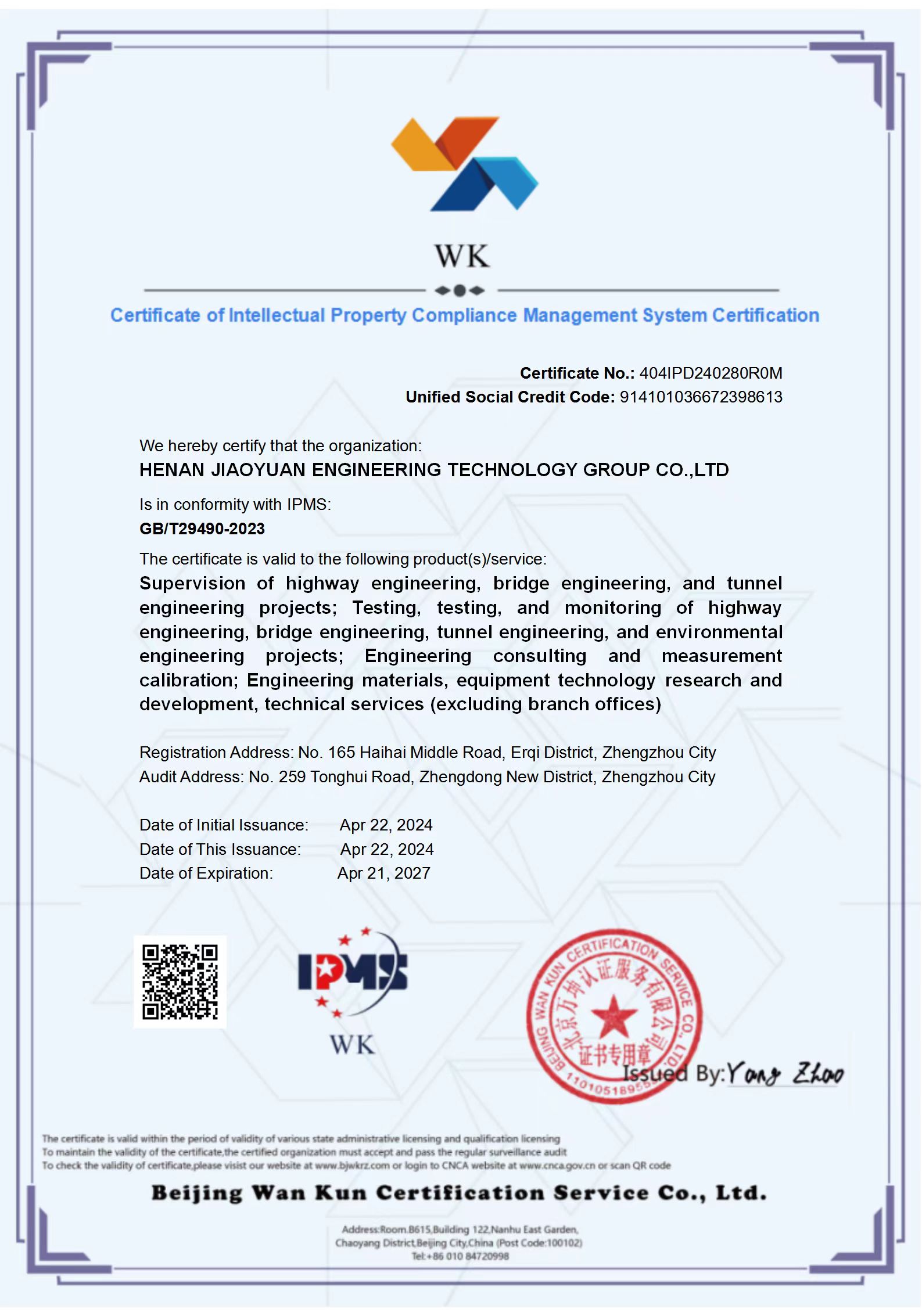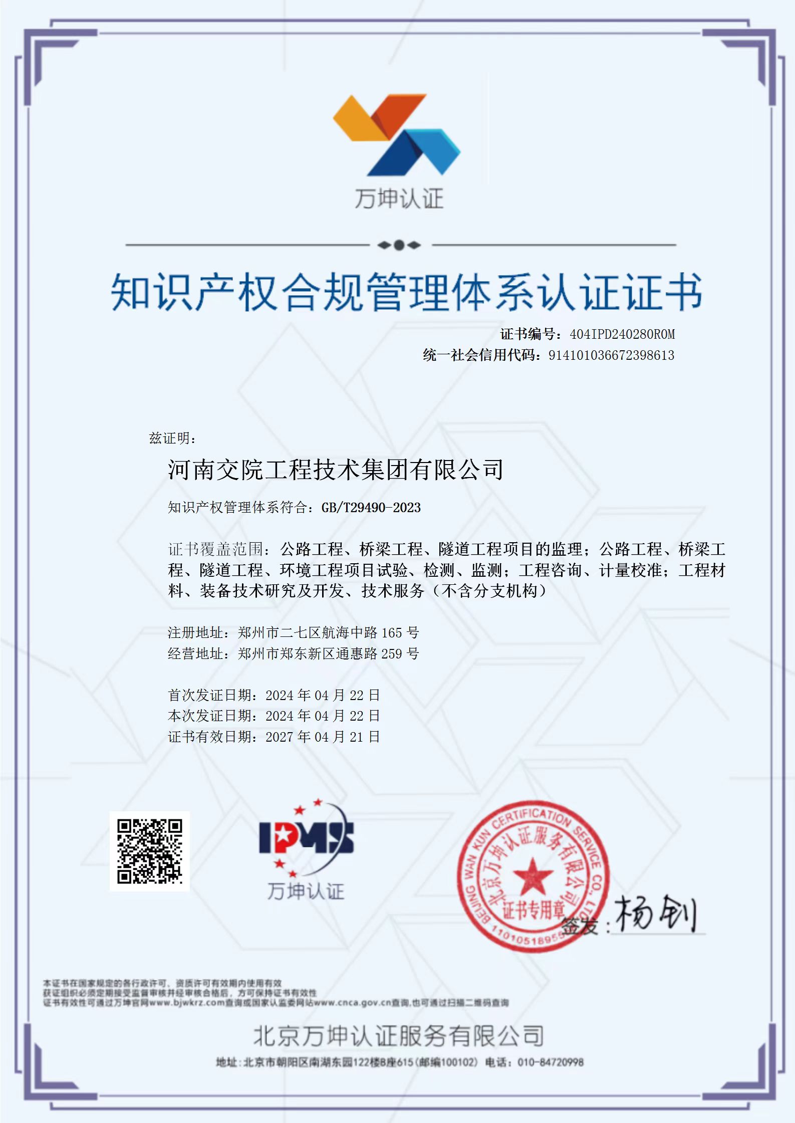 知识产权管理体系认证是指由国家认证认可监督管理委员会(CNCA)批准的第三方认证机构,依据国家标准《企业知识产权管理规范》(GB/T 29490-2013),证明社会组织的内部知识产权管理体系是否符合规范要求的合格评定活动。交院技术集团将持续加大研发投入,充分激发创新活力,进一步提升知识产权管理和服务水平,为河南经济社会高质量发展贡献力量。